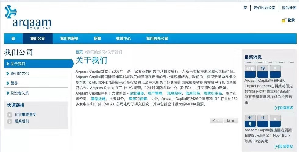 Arqaam Capital集团是一家由迪拜王室家族以及本地家族基金控股的大型综合性投资银行,业务包括中东各国王室、家族基金和信托的管理,还包括证券、债券及金融衍生品的发行管理等,目前集团每年各类有价证券的交易量高达500亿美元,是名副其实的中东地区一流投行。